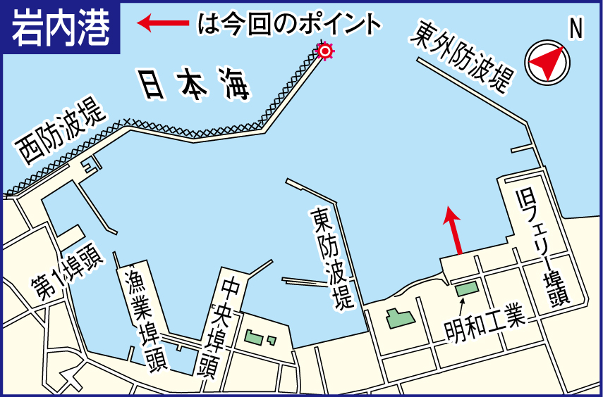 杉山さんは6時半ごろ、防波堤先端右角に投げザオ3本を並べた。仕掛けは2本バリの遊動式で、ハリはチヌ7号相当を使用。1つだけ仕掛けの中間にコマセロケットLLサイズを付けた。コマセは、チューブ容器入りのイカゴロコマセに、アミエビと粉末集魚剤を加えた。ハリにエビ粉塩イソメを付けて、1時方向と12時方向へ120mほど遠投。コマセカゴ付き仕掛けは11時方向へ50m程度投げた。