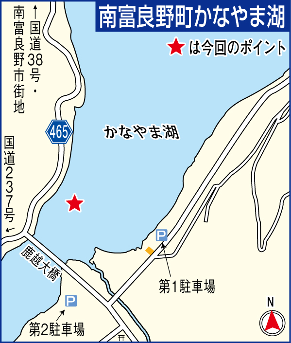 この時季としては珍しくぽかぽか陽気だった午前10時ごろ、鹿越大橋近くの第1駐車場沖に到着。凍てついた氷上で15組ほどがワカサギ釣りを楽しんでいた。手前側から釣果を聞いて回ると10〜50匹の人が多かったが、駐車場から300mほど沖に3ケタを上げるベテランがいた。