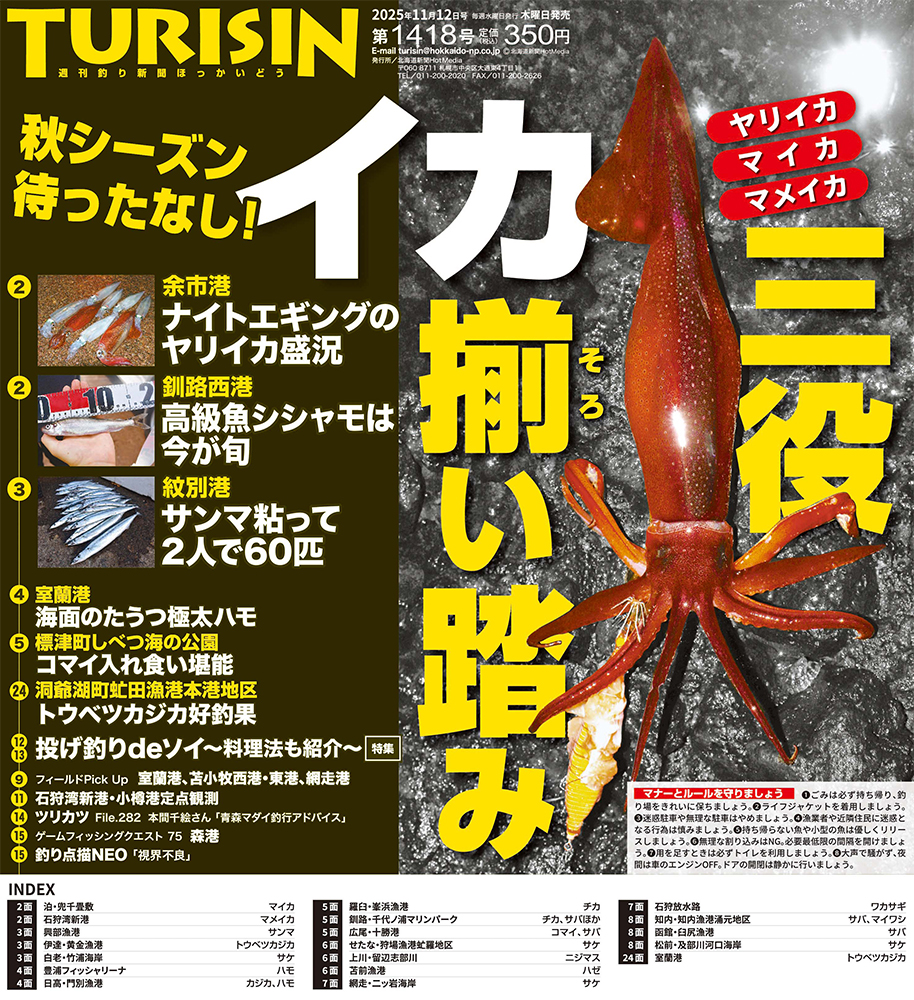 主な記事●網走港/サンマ群れ到来でお祭り騒ぎ●興部町沙留漁港/サンマ日中に50匹超え●積丹沖/自己新ブリ14kg超え大物出る●浦幌町厚内漁港/小型ながらコマイ3…