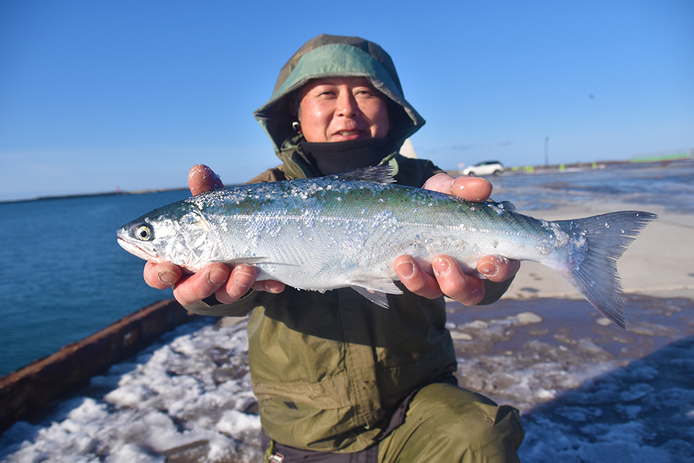 長尾さんや他の釣り人の話を総合すると、第1埠頭から第2埠頭にかけての「コの字エリア」では合計10匹ほどのサケが上がったと思われる。ほとんどが早朝に釣れたようだ。