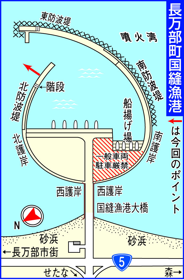 午前11時半ごろ、同港の北防波堤の階段上を訪れると知人が帰り支度をしていた。3連休の初日のためか、港内は30人ほどの釣り人が訪れて、投げ釣りやロックフィッシングを楽しんでいた。