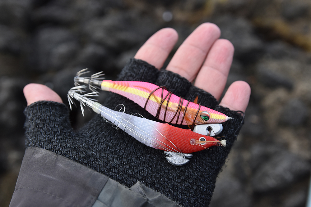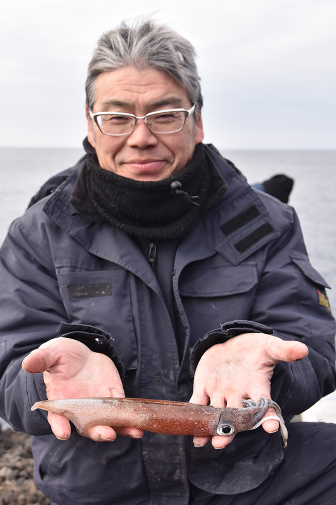 午後10時ごろ、磯場の先端に札幌市の小神敏さん(55)がヤリイカ、マイカ狙いで入釣した。エサ巻きエギングのエギは、主に2.5号や3号のノーマルタイプやエサ巻き用のレッドヘッド、ピンク系を使用した。塩で締めた鶏の胸肉を付けて、20〜30mキャスト。20〜30秒沈めたら、スローリーリングをベースに、随時ロッドをゆっくりとしゃくってアクションに変化を付けた。