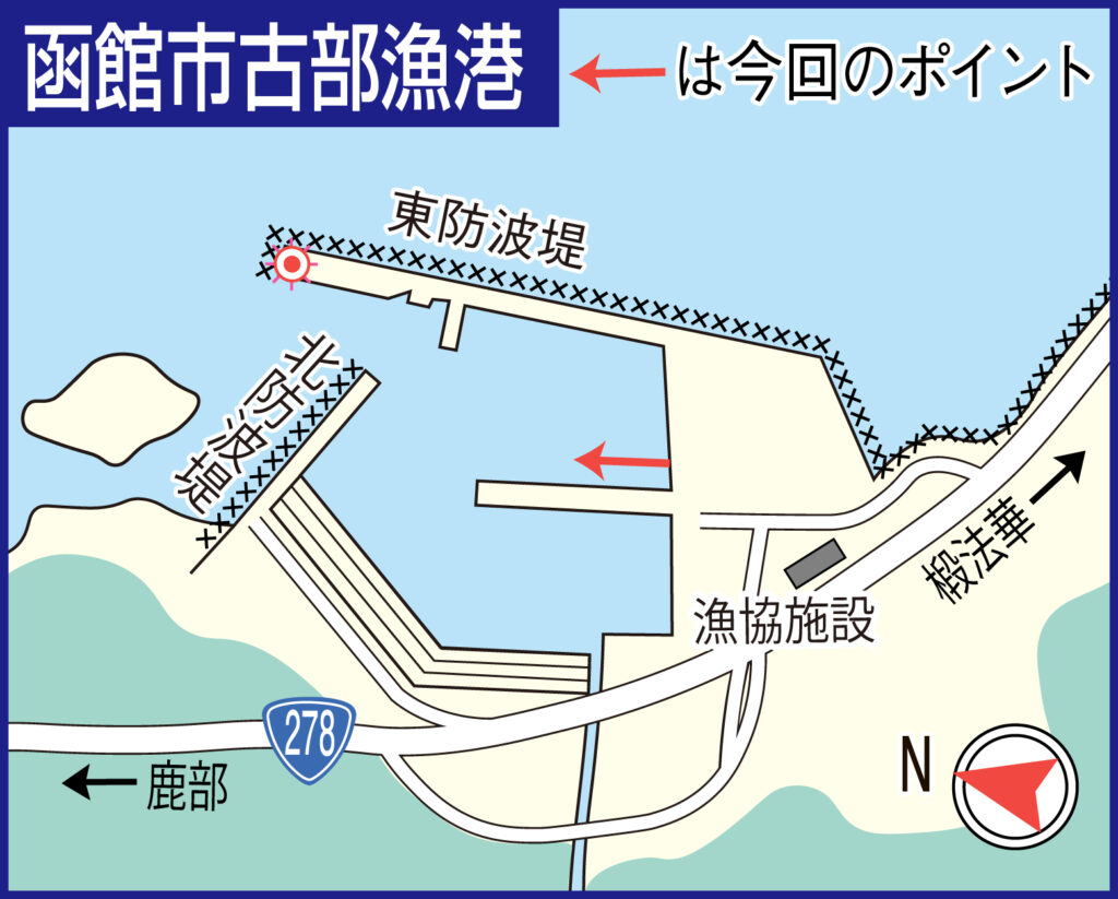 6日正午ごろ、函館市古部漁港の突堤右側の岸壁で、小気味良く魚を釣り上げる男性を発見。釣果を尋ねると「100匹くらいは釣ったかな!」と笑顔で応じてくれた。